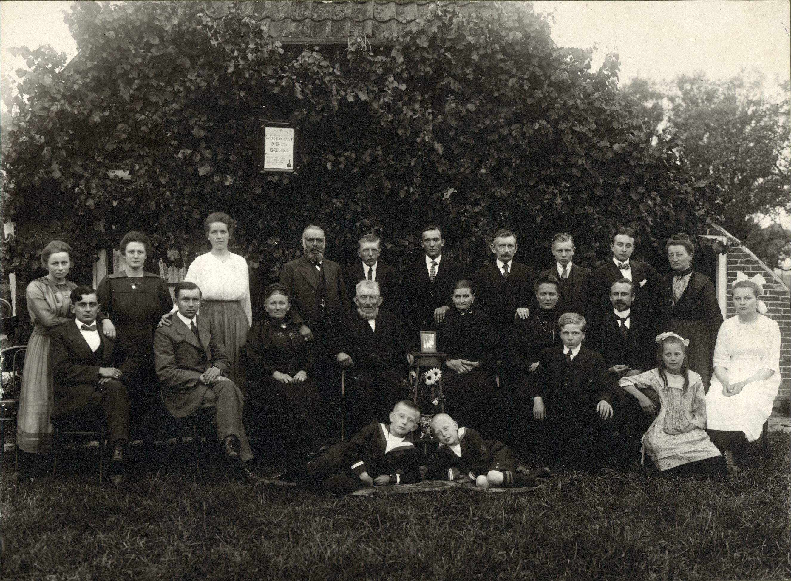 VIt. ![]() ![]() Toeziend voogd van de bruidegom Melis Teune. Zij wonen in 1910 in Hoogkerk. Zij wonen in 1915 in Groningen aan de Friesche Straatweg 163. In het jaar 1920 vieren zij het gouden huwelijksfeest (zie advertentie). Dan wonen ze ook nog Friesche Straatweg 163. Zij woont op het moment van overlijden te Hoogkerk aan de Gaaikemadijk. Zij zijn beide begraven te Hoogkerk Perk B rij 4 nummers 19 en 20 (oude gedeelte, achterin rechts achter de heg, zie foto) Uit dit huwelijk: 1. BOOIKE TEUNE [1428], geb. Hoogkerk 16-2-1871, overl. Groningen 22-10-1926, tr. (1) [1044] Hoogkerk 13-05-1893 (6) LUBBERTUS HELMUS [2719], geb. Kummerzijl (Kommerzijl, gem. Oldehove) ca. 1867, overl. voor 1895, tr. (2) [542] Adorp 1-6-1895 (15) HENDRIK ROEMERS [1433], geb. Groningen ca. 1863, overl. na 1926. 2. GERRITJE TEUNE [1429], geb. Hoogkerk 21-5-1873, overl. Hoogkerk 21-8-1873. 3. GERRITJE TEUNE [1430], geb. Leegkerk 5-7-1874, tr. [543] Groningen 6-12-1900 (507) JACOB DEEN [1434], geb. Groningen 20-9-1872. Dit zijn de oma en opa van Jacob Deen. Zij hebben de vader van Gerritje nog een tijdje in huis gehad en woonden toen Nieuwe Bot. straat 14. 4. DANIEL PIETER TEUNE [1431], geb. Hoogkerk 13-10-1877, volgt VIIt. 5. HENDRIK (HENRY) TEUNE [1432], geb. Hoogkerk 12-1-1880, volgt VIIu. |